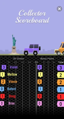 Customize your game's vehicle playing pieces -- play solo or manage up to 6 vehicles so your fellow passengers can get in on the fun. Vehicle position and ranking adjusts when a license plate is collected.