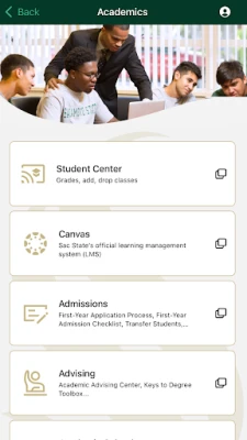 • Academics: Canvas, Academic Advising, Class Schedule, Library, Bookstore