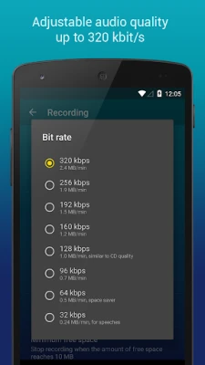 Quality Settings. Customize audio quality with changeable bit rate up to 320 kbps. You can also record in WAV, OGG, M4A, and FLAC (experimental) formats.