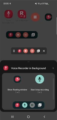 Application to record audio (voice) in the background using widgets, a shortcut launcher, quick settings (a tile), a floating window which appears on the top of all other applications or different auto-start recording options (set a timer, recording on charging, Bluetooth, AUX connection events).
