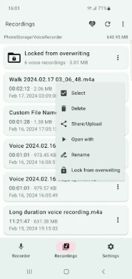 - Recording to any folder of the internal storage (memory) of your device or to an external SD card.